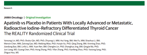 2021年12月16日,权威医学杂志《JAMA Oncology》(影响因子31.777)在线发表阿帕替尼的一项III期临床研究(REALITY)——甲磺酸阿帕替尼片治疗局部进展/转移性放射性碘难治性分化型甲状腺癌(RAIR-DTC)患者的多中心、随机、双盲、安慰剂对照临床研究。此研究由北京协和医院的林岩松教授和南京金陵医院的秦叔逵教授发起,在全国21个研究中心展开,由BJL平台医药中央医学事务部团队支持完成。